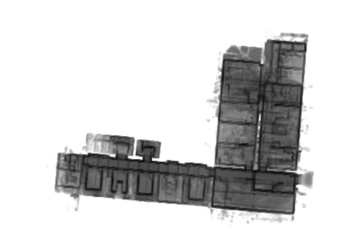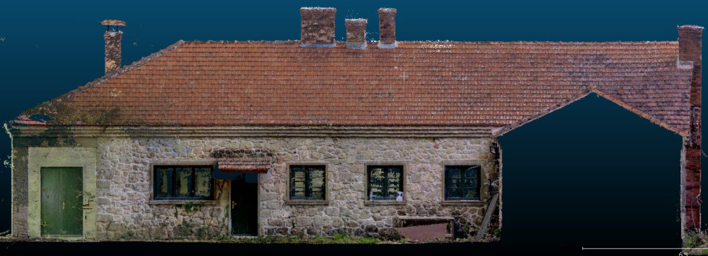 Το project έγινε έγινε από την εταιρία All3D της οποίας υπήρξαμε συνιδρυτές μαζί με την εταιρία Landmark, σε συνεργασία με την τεχνική εταιρία ΓΑΙΑΚΟΜ . Πρόκειται για αποτύπωση ιστορικού κτιρίου στο Τατόι και ζητήθηκαν σχέδια 2D με ακρίβεια της τάξης του εκατοστού. Έτσι επιλέχθηκε να γίνει συνδυασμός μεθόδων. Για μεν το εξωτερικό έγινε αποτύπωση με εναέρια φωτογραμμετρία και σταθερό laser scanner και στο εσωτερικό αποτύπωση με handheld mobile laser scanner και σταθερό scanner. Για να γίνει αξιόπιστο fusing των αποτελεσμάτων των διαφόρων μεθόδων δημιουργήθηκε δίκτυο με σημεία τα οποία αποτυπώθηκαν με την τεχνική εξαναγκασμένης κέντρωσης. Εδώ φαίνεται οριζόντια τομή από το pointcloud του εσωτερικού, που προέκυψε από το fusing των δύο pointclouds, από τον σταθερό και τον handheld laser scanner.